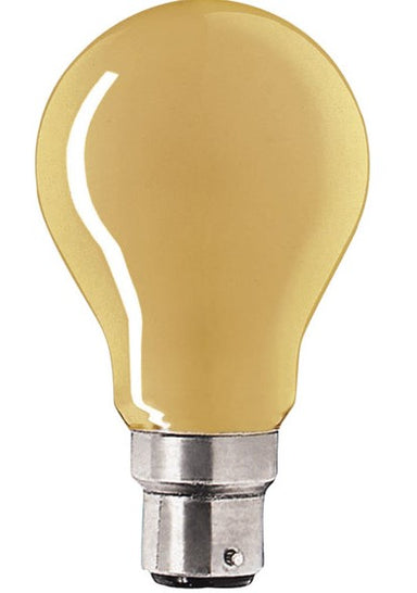 240V 25 Watts Base B22d Standard Bayonet Fitting Finish: Amber Coloured Incandescent light bulbs produce an artificial light more condusive to our ...