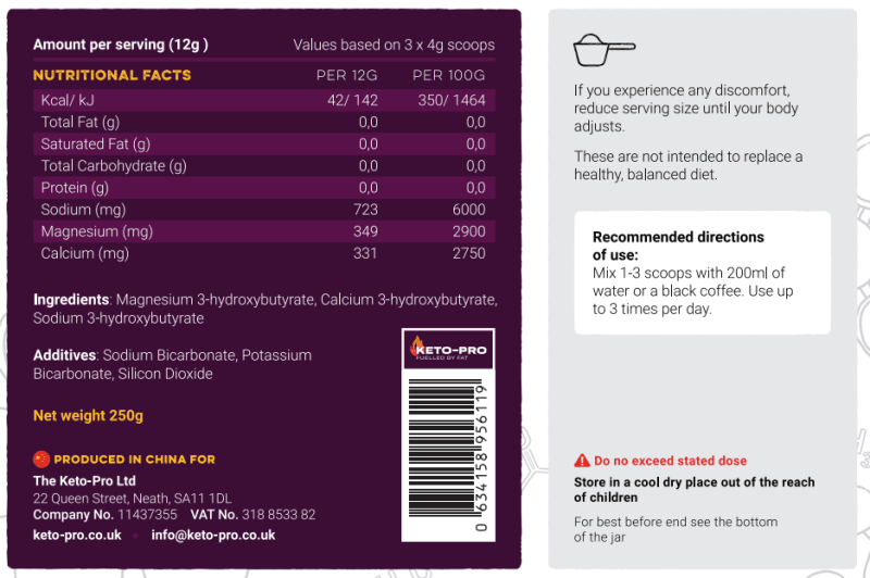Mix 1 -scoops with 250ml of water or a black coffeeConsume up-to 3 times per day. Consume 30mins to one hour before eating. For Fat loss, don’t over consume, twice a day is plenty, and don’t consume late afternoon, give the body a chance to ramp up it’s own endogenous ketone production.